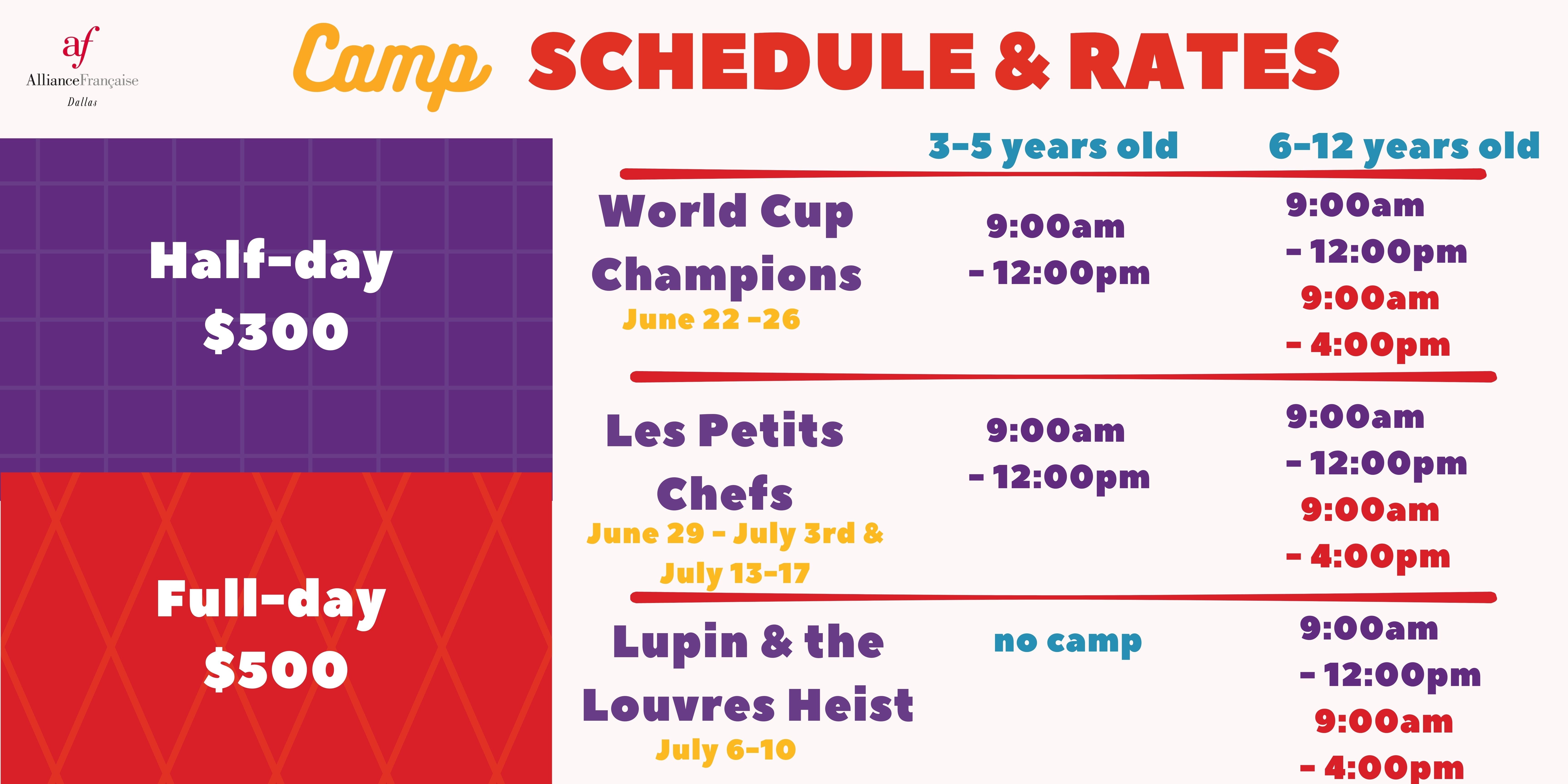 Once a camp week has begun, schedule changes are not permitted. All registration changes must be made through the Alliance Française de