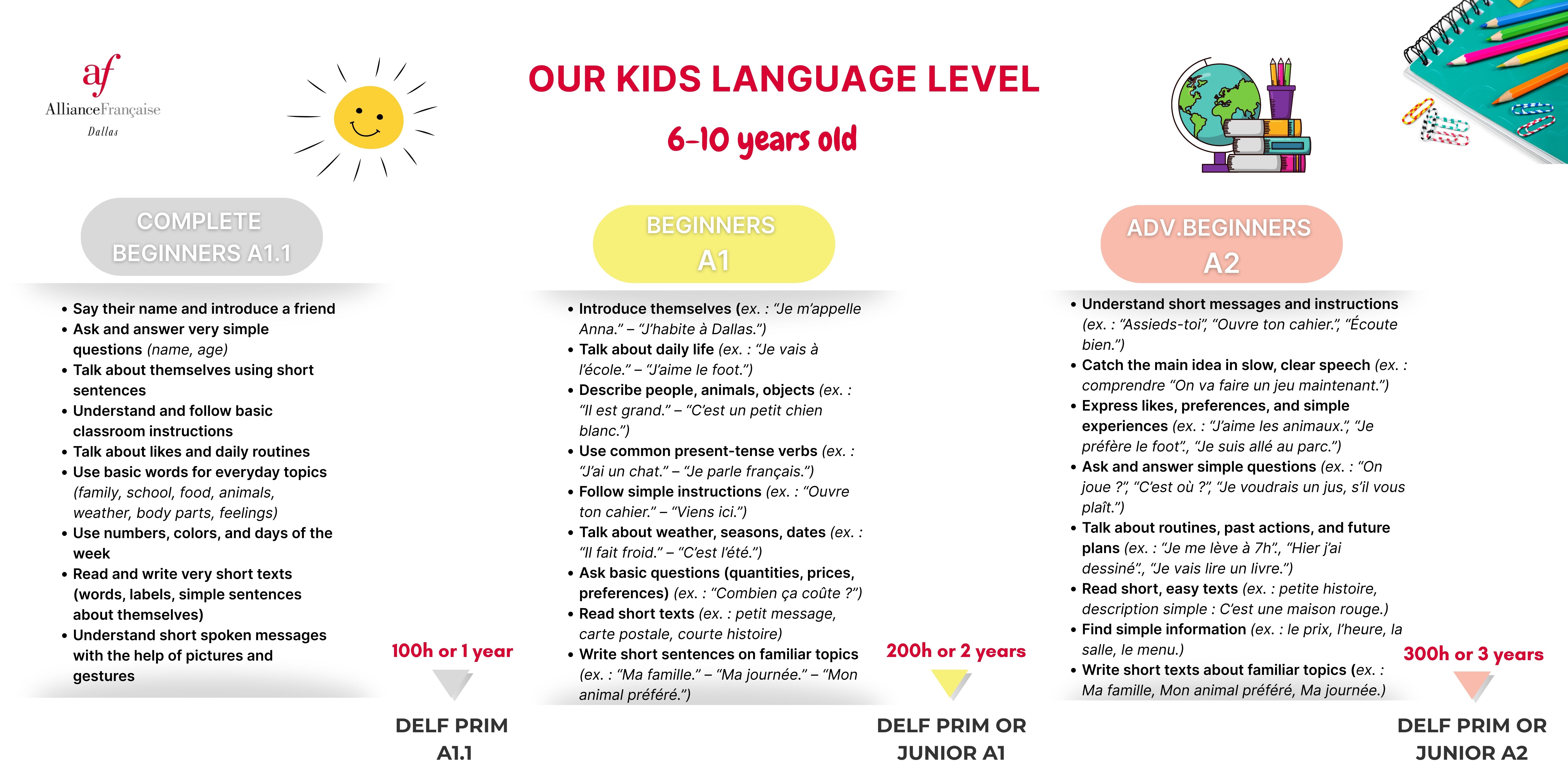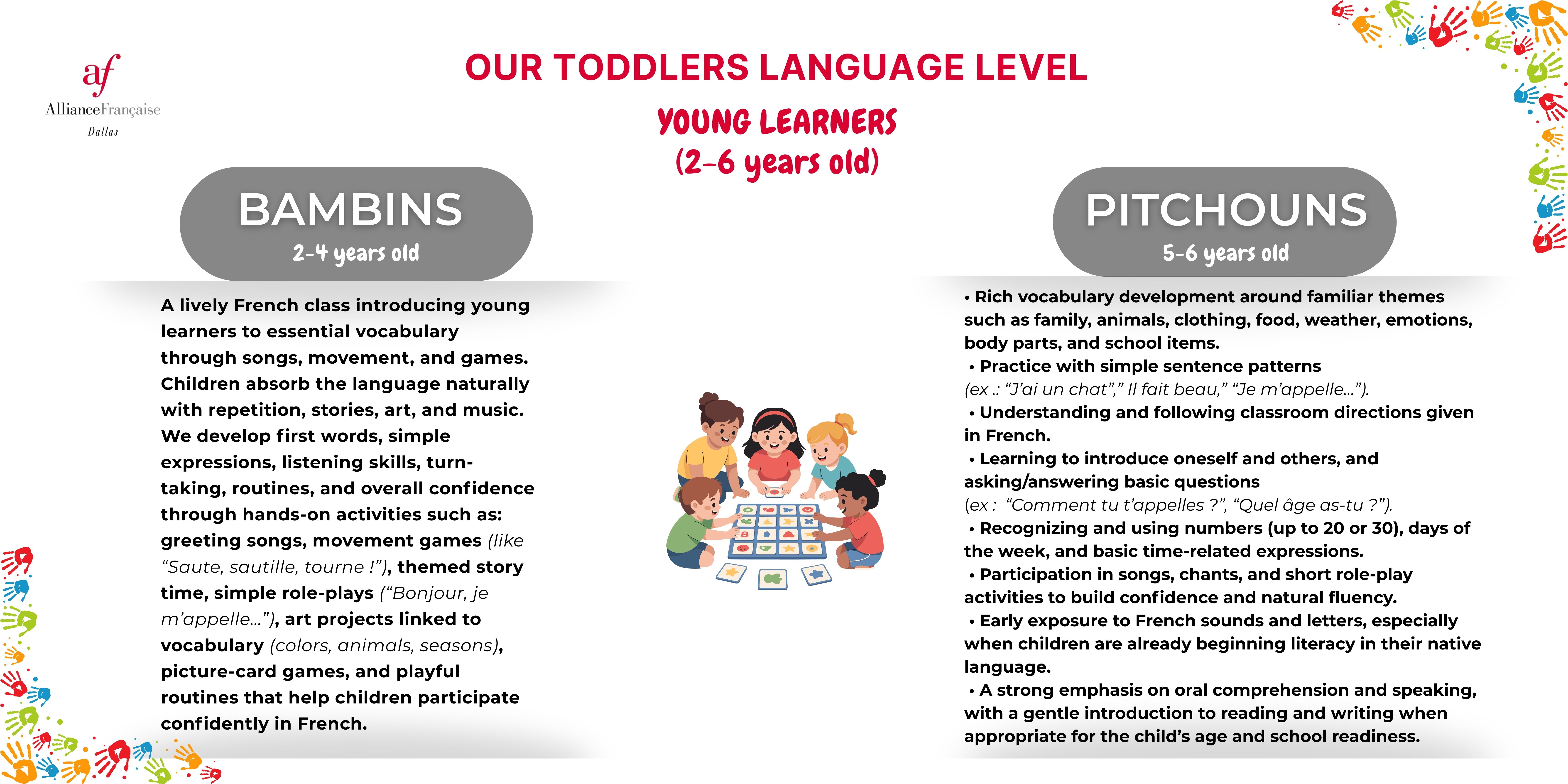 The Alliance Française of Dallas provides group classes for both French speaking and French learning students.All of our classes are taught by native French instructors, who will provide your children with an authentic French immersive experience. Knowledgeable educators foster learning in a natural way, through visual, kinesthetic and auditory experiences.