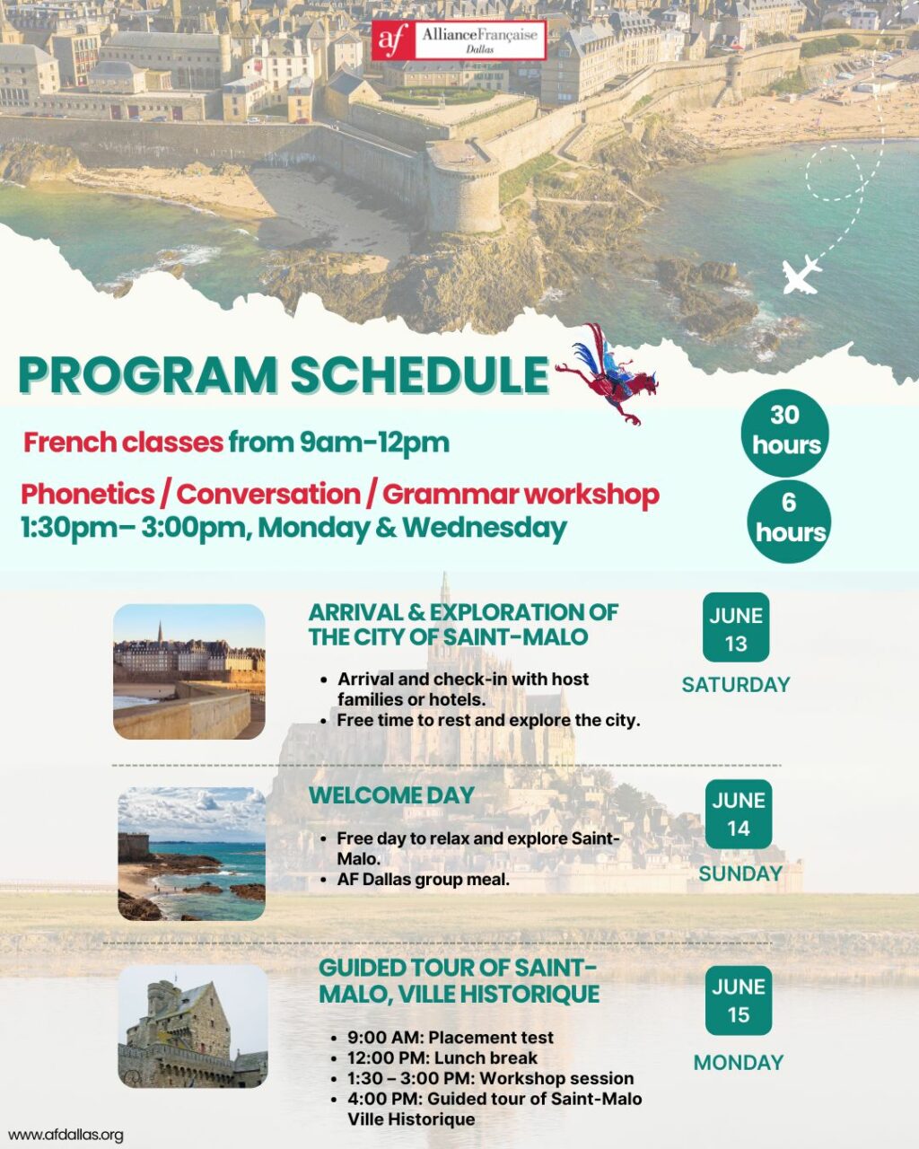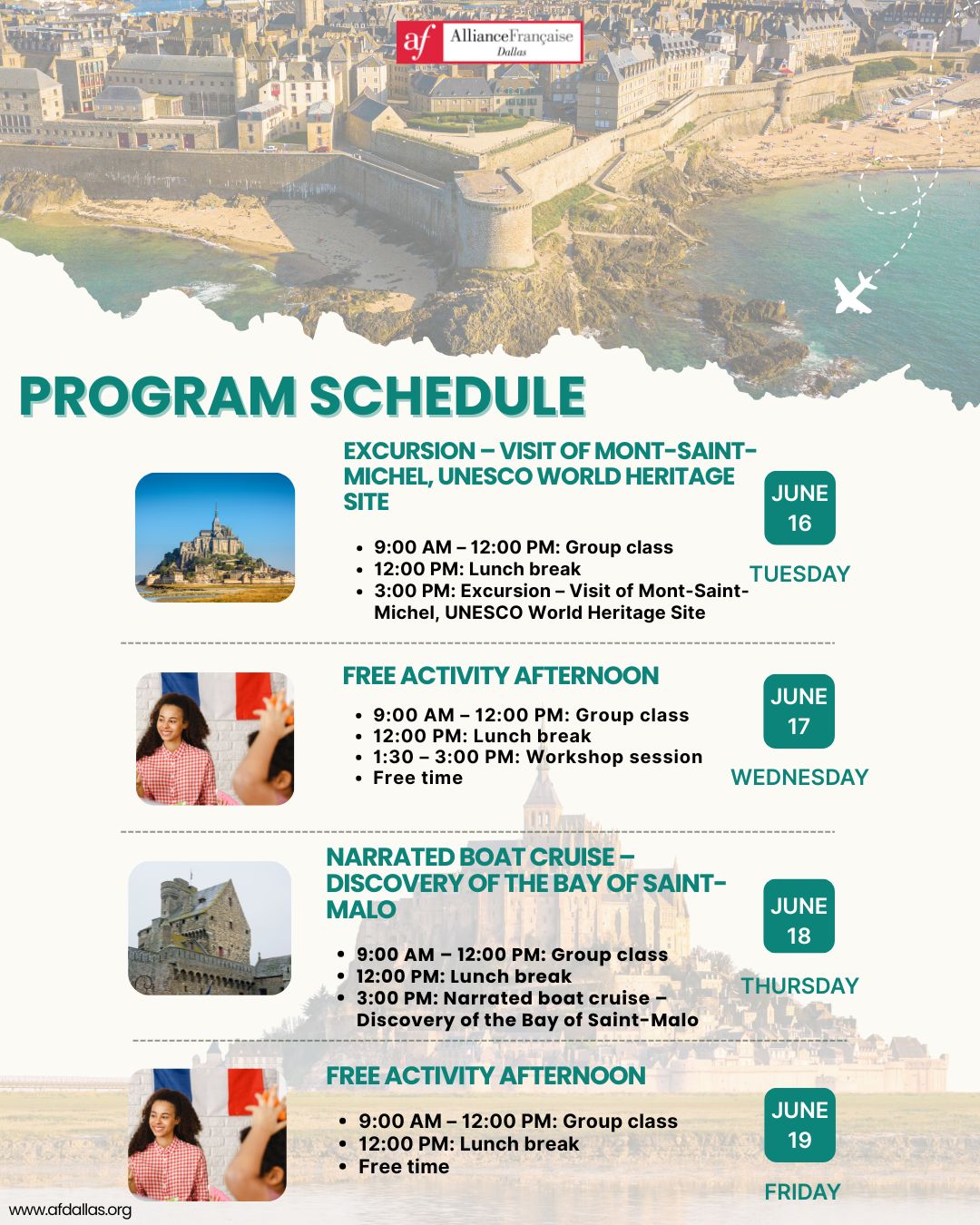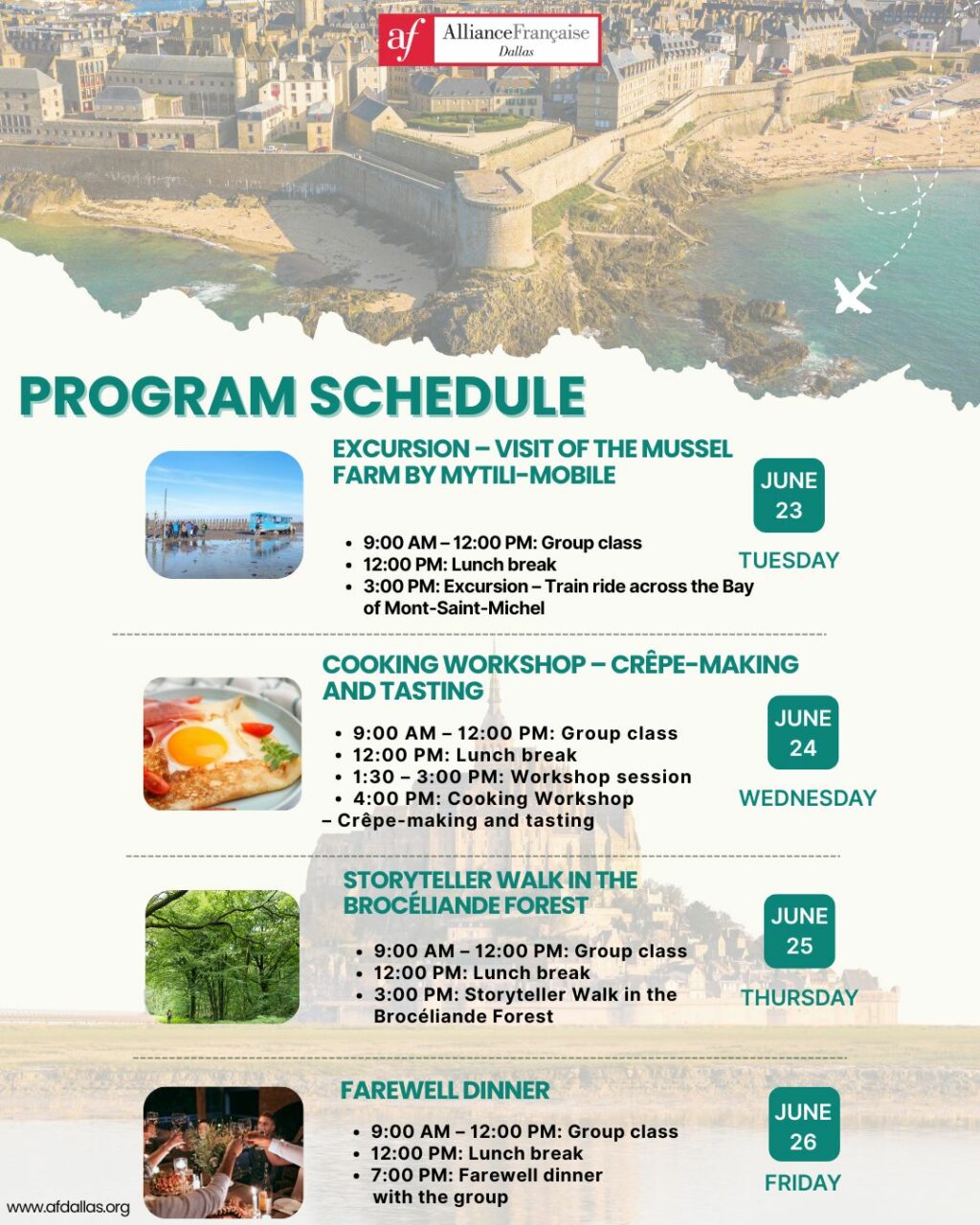 Before purchasing a package please download and fill out the following the forms (Terms & Conditions Trip to Auvergne 2025_AF Dallas and Travel release waiver_AF Dallas). You can send the filled out forms to info@afdallas.org